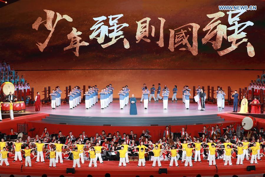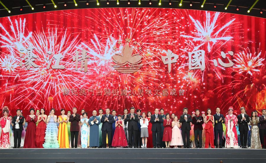 Chinese President Xi Jinping, also general secretary of the Communist Party of China Central Committee and chairman of the Central Military Commission, joins main cast members in singing a patriotic song to deliver wishes for the motherland's prosperity and Macao's brighter future while attending a grand gala in celebration of the 20th anniversary of Macao's return to the motherland, in south China's Macao, Dec. 19, 2019. (Xinhua/Huang Jingwen)