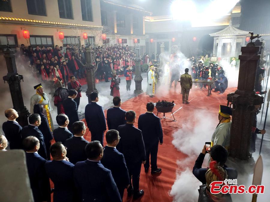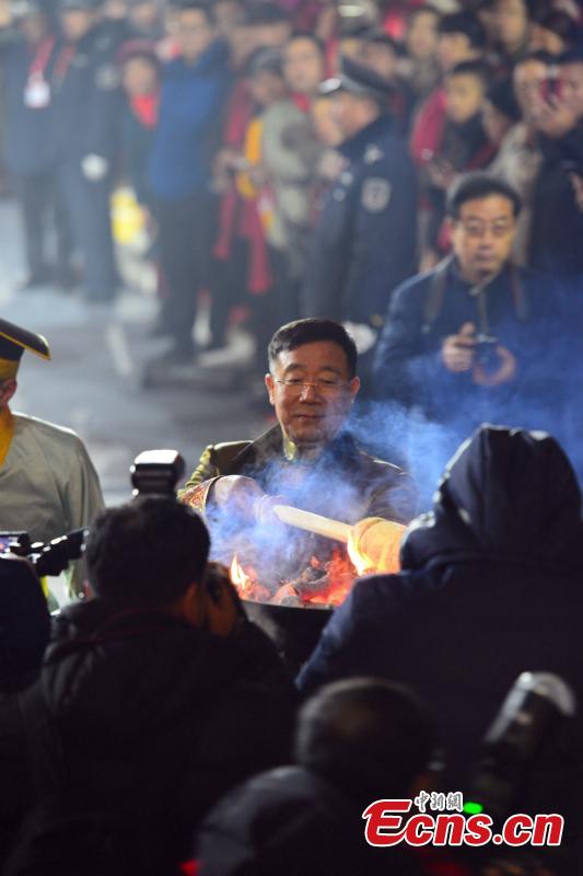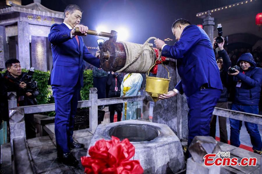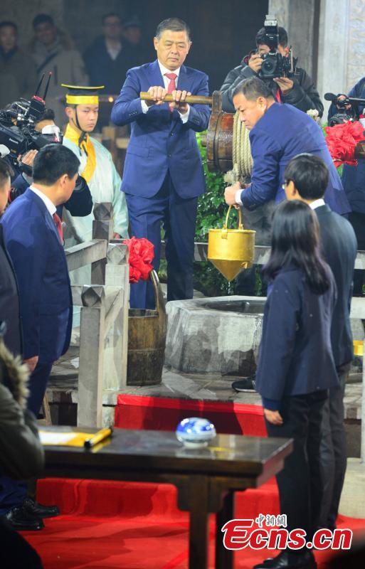 Water is drawn from an ancient well during an annual ceremony on Dec 22, 2019, the eve of the winter solstice in Dong’e county, East China’s Shandong province. Water drawn from the 3000-year-old well “Gu’e” will be used to make ejiao, or donkey hide gelatin. The event is held to further publicize the nutrition value of ejiao and the importance of taking tonics in the winter solstice. (Photo: China News Service/ Zhao Xiao)
