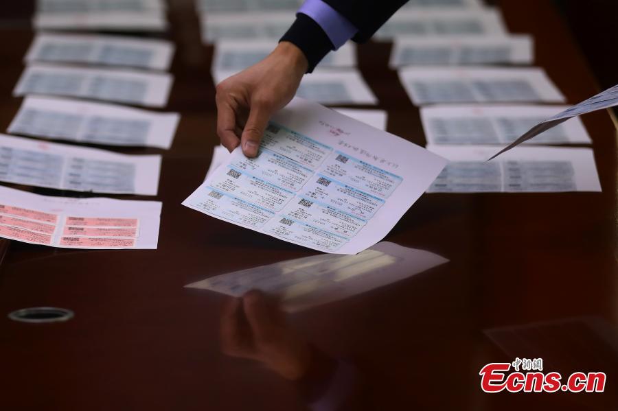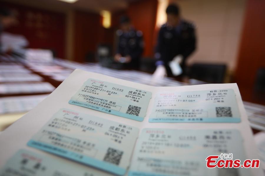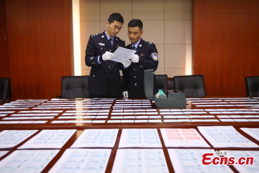 A railway police officer checks counterfeit train tickets in Nanjing, capital of Jiangsu Province on Dec. 23, 2019. Railway police in Nanjing arrest two suspects after busting two dens that produced and sold fake tickets. (Photo/China News Service)