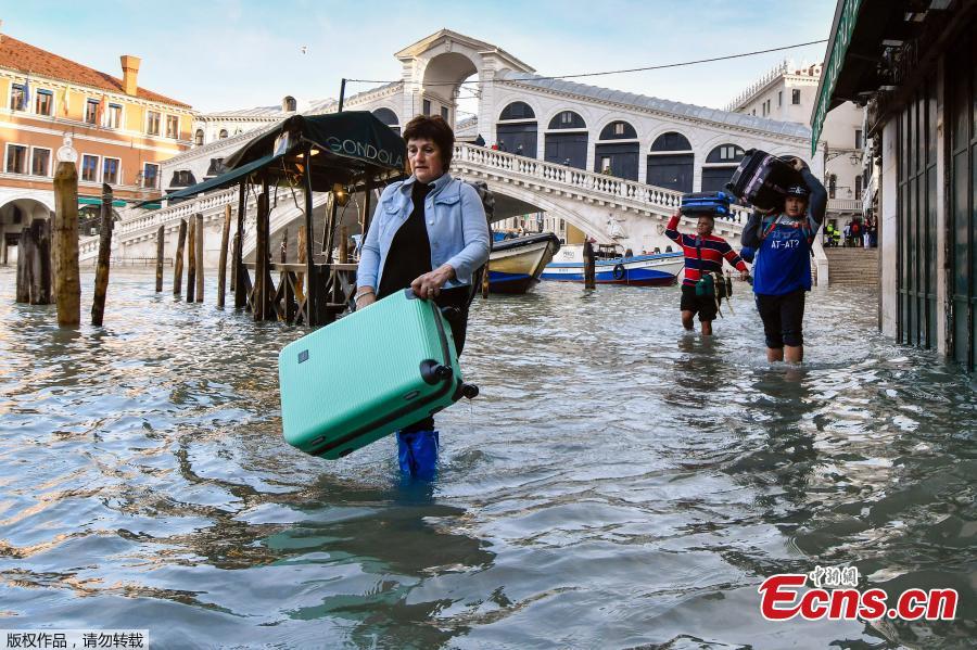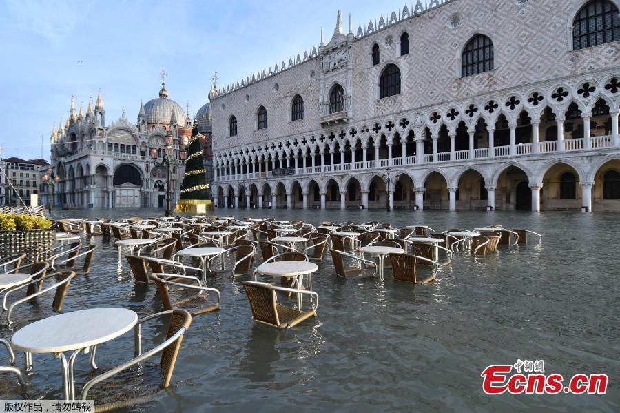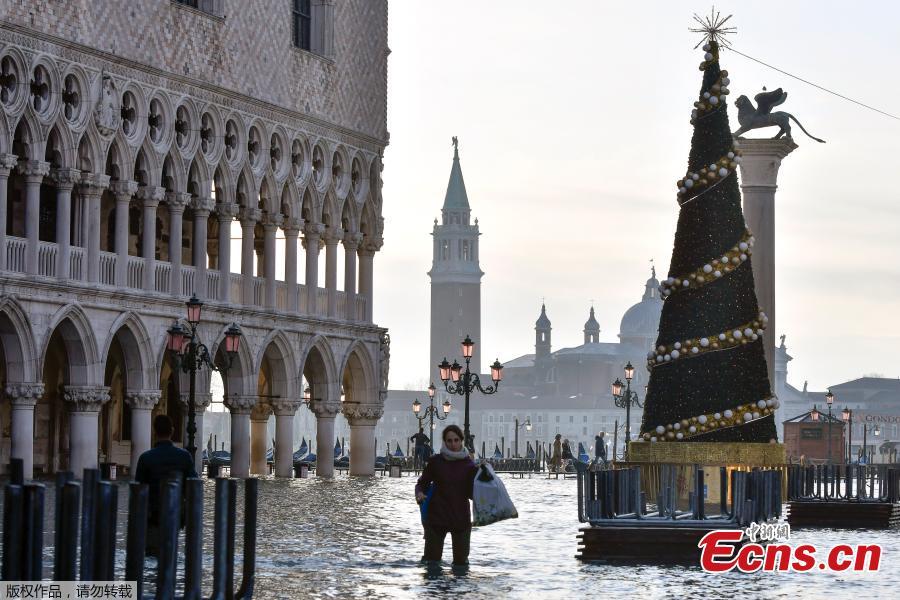 Venice is enduring yet more flooding just weeks after high tides caused a billion euros of damage in the historic city. Tourists could be seen carrying their suitcases aloft and wading through water in the Italian city's famous St Mark's square after an 'exceptional' 1.44m peak tide monday morning, December 23,2019. The lagoon city is still counting the damage caused by the 1.87-meter-high tide on November 12, the highest in more than 50 years.(Photo/Agencies)