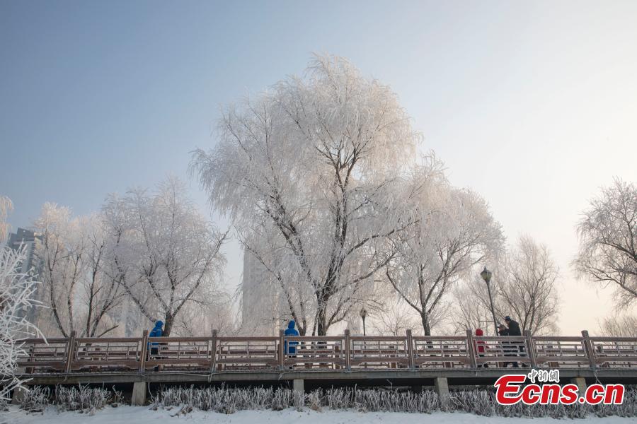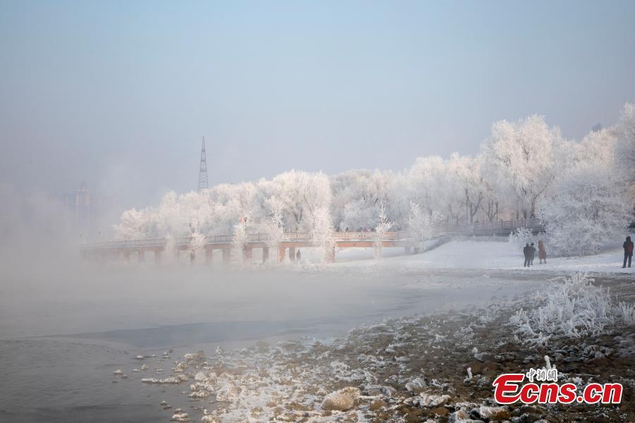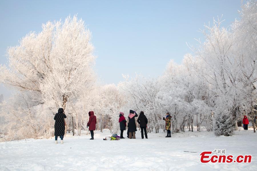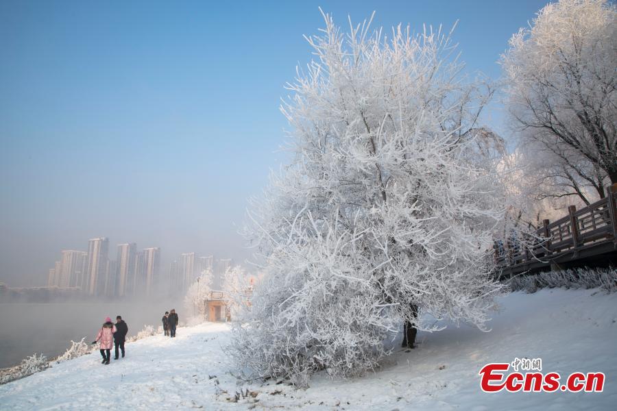 Due to continuous drop of temperature, rime sight appears trees along the banks of the Songhua River, Jilin province, December 23, 2019. The crystal-clear spectacle has attracted many tourists to the scene. (Photo: China News Service/Zhu Wanchang)