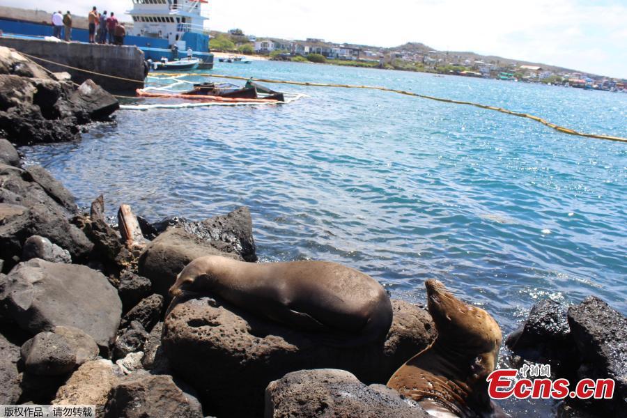 Seals are seen at the site where a barge carrying 600 gallons of diesel sank at the La Predial dock of San Cristobal, the easternmost island of the Galapagos archipelago, in Ecuador, December 23, 2019. (Photo/Agencies)