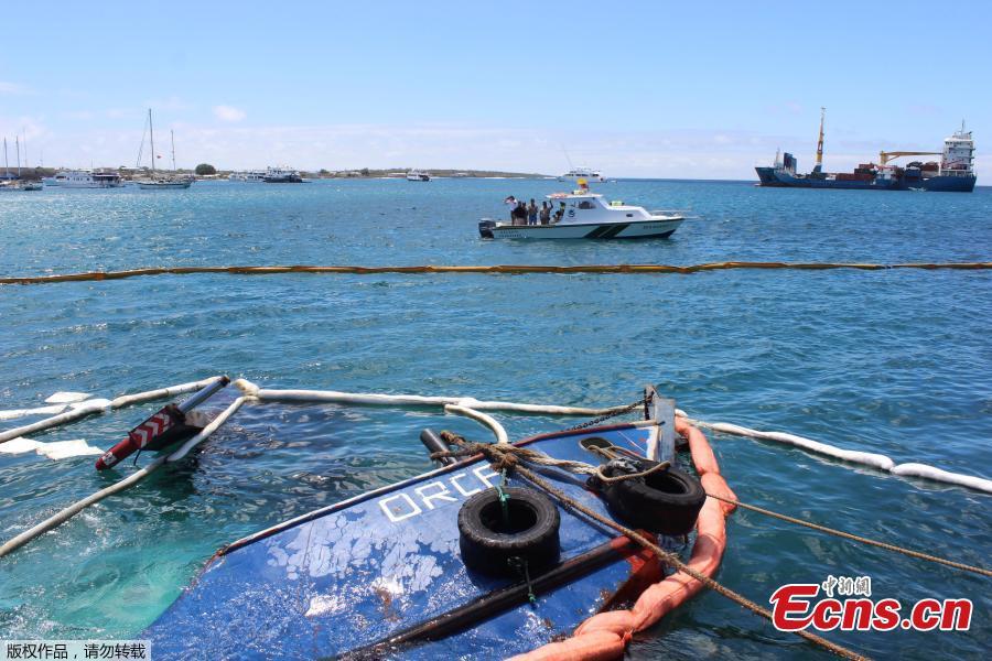 Ecuadoran authorities are seen at the site where a barge carrying 600 gallons of diesel sank at the La Predial dock of San Cristobal, the easternmost island of the Galapagos archipelago, in Ecuador, December 23, 2019. (Photo/Agencies)
