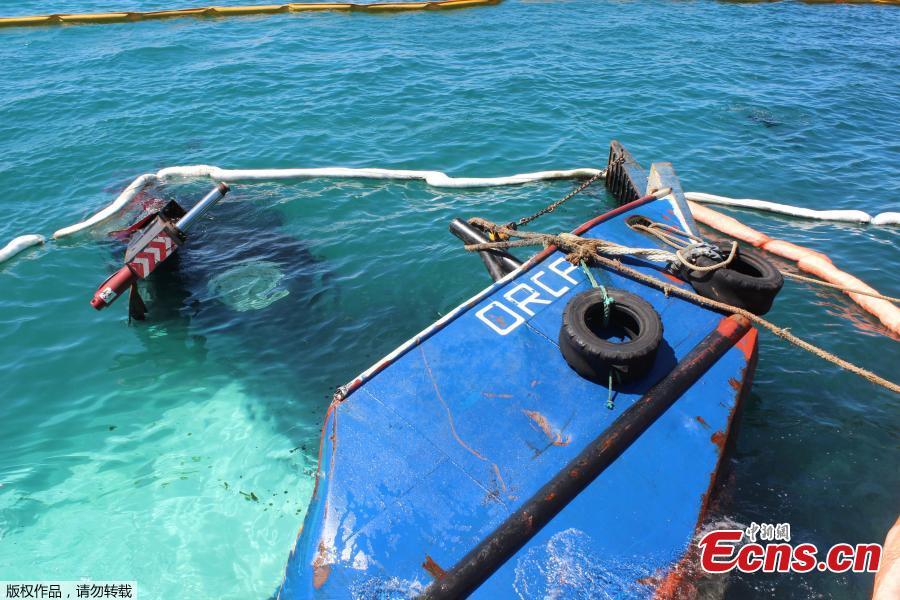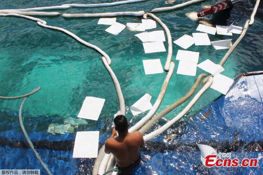 A man works at the site where a barge carrying 600 gallons of diesel sank at the La Predial dock of San Cristobal, the easternmost island of the Galapagos archipelago, in Ecuador, December 23, 2019. (Photo/Agencies)