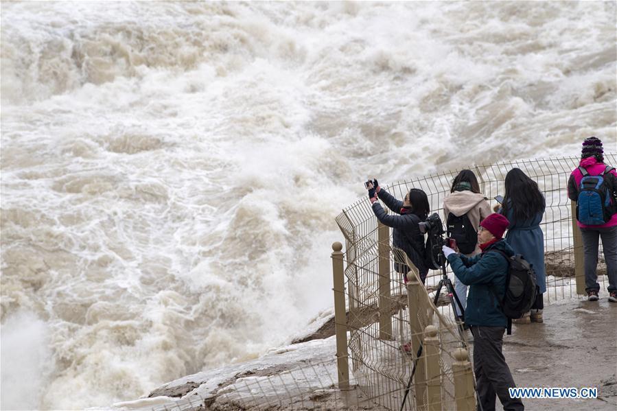Tourists visit the Hukou Waterfall scenic spot in Jixian, north China's Shanxi Province, Dec. 24, 2019. Hukou waterfall is located on the border area between north China's Shanxi and northwest China's Shaanxi provinces. (Xinhua/Yang Chenguang)