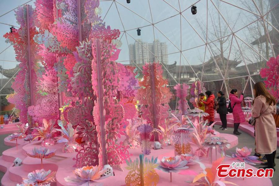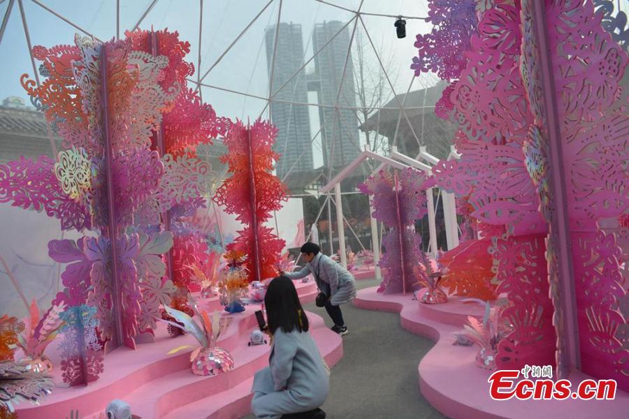 People are attracted by sculptures in downtown Chengdu, Southwest China’s Sichuan province, December 26, 2019. Installed in a glass room, the sculptures featuring paper-cutting effect look like plants growing in greenhouse. (Photo: China News Service/ Zhang Lang)