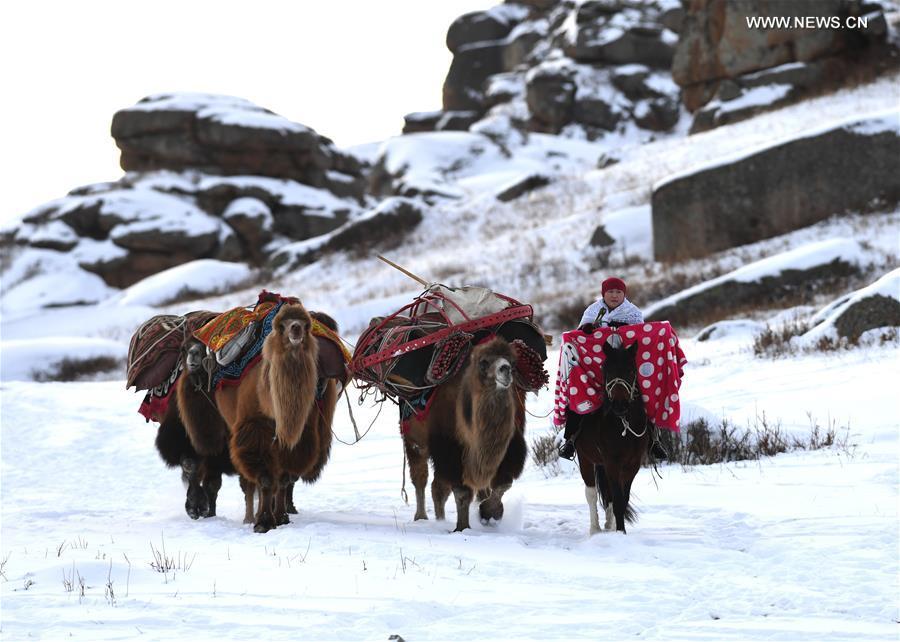 A herdswoman performs driving camels at the second Sawur cultural tourism festival on animal husbandry in winter in Jeminay County, northwest China's Xinjiang Uygur Autonomous Region, Dec. 29, 2019. (Xinhua/Sadat)