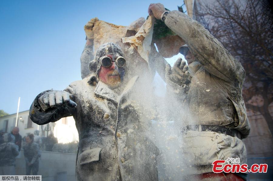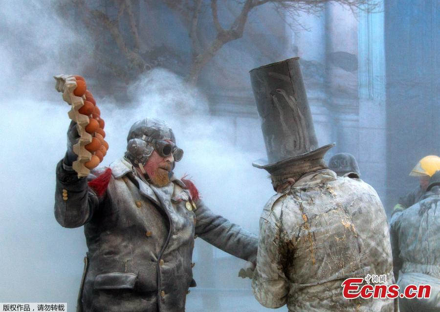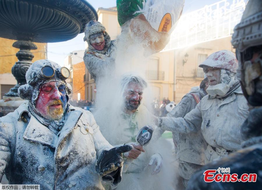 Two revellers dressed in mock military garb empty out a sack of flour over another participant during the "Els Enfarinats" battle in the southeastern Spanish town of Ibi on December 28, 2019. During this 200-year-old traditional festival participants known as Els Enfarinats (those covered in flour) dress in military clothes and stage a mock coup d'etat as they battle using flour, eggs and firecrackers outside the city town hall as part of the celebrations of the Day of the Innocents, a traditional day in Spain for pulling pranks. (Photo/Agencies)