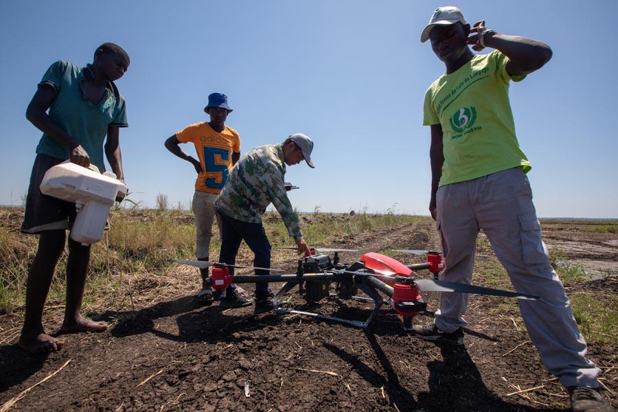 A Chinese agricultural expert (second right) instructs local workers to use a drone to spray herbicides. (Photo/Xinhua)