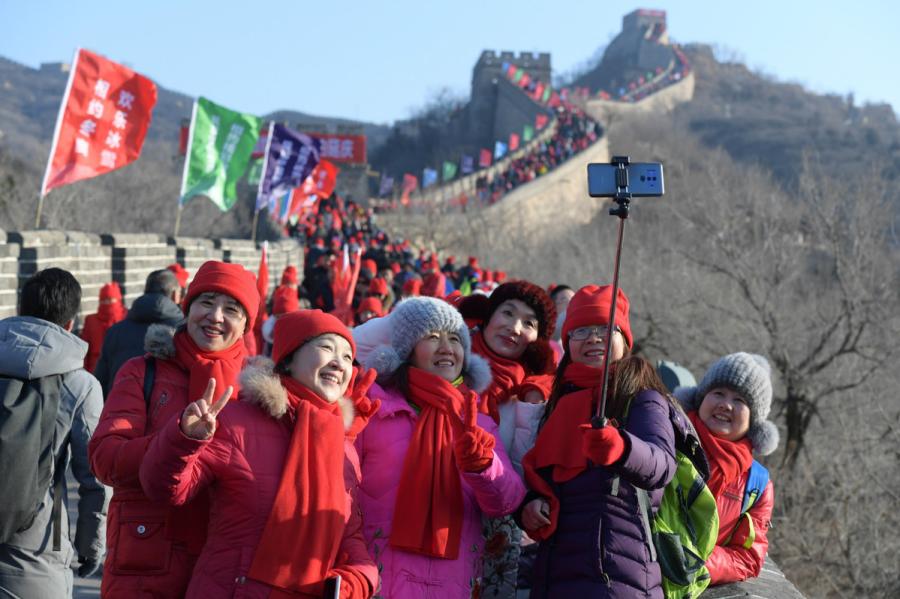 A group poses for a selfie on the Badaling section of the Great Wall as a way to celebrate the New Year on Jan 1, 2020. (Photo by Wei Xiaohao/chinadaily.com.cn)