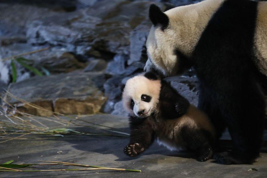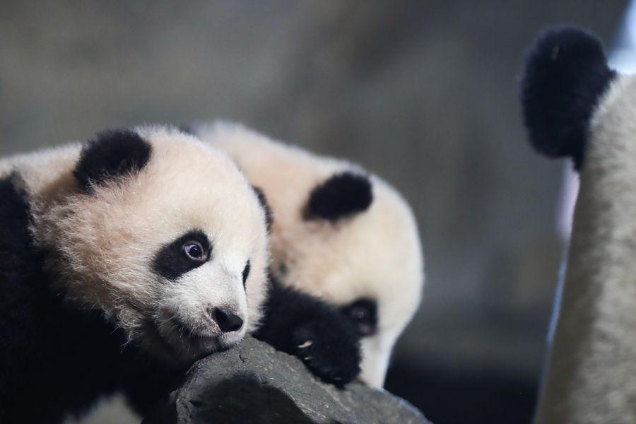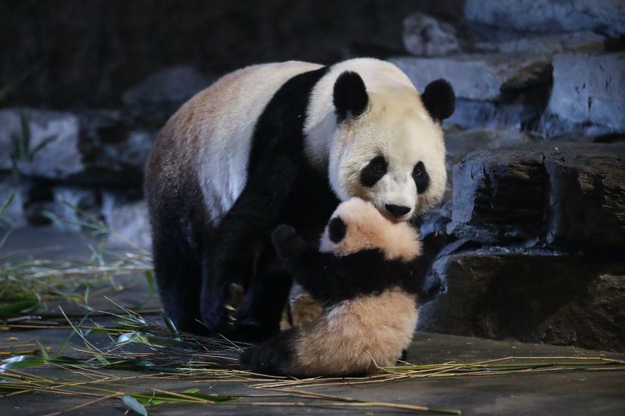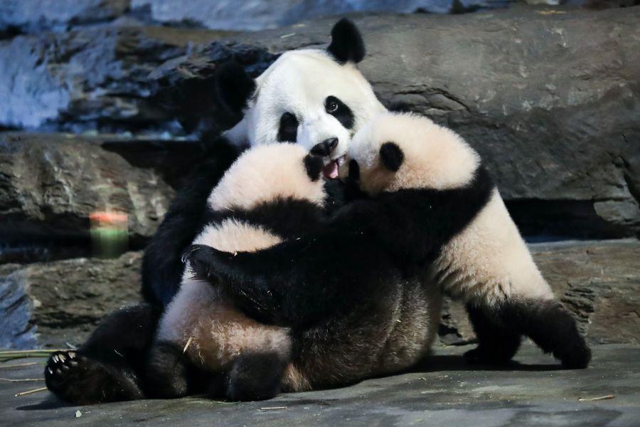 Giant panda Hao Hao plays with one of her cubs at the Pairi Daiza zoo in Brugelette, Belgium. (Xinhua/Zhang Cheng)