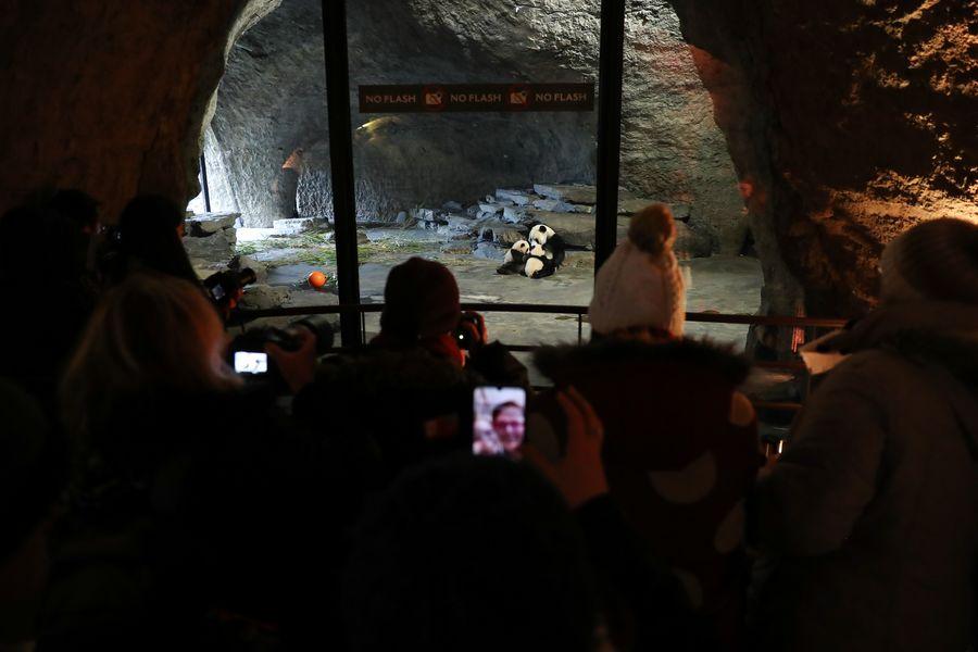 Visitors view giant panda Hao Hao and her twin cubs at the Pairi Daiza zoo in Brugelette, Belgium. (Xinhua/Zhang Cheng)