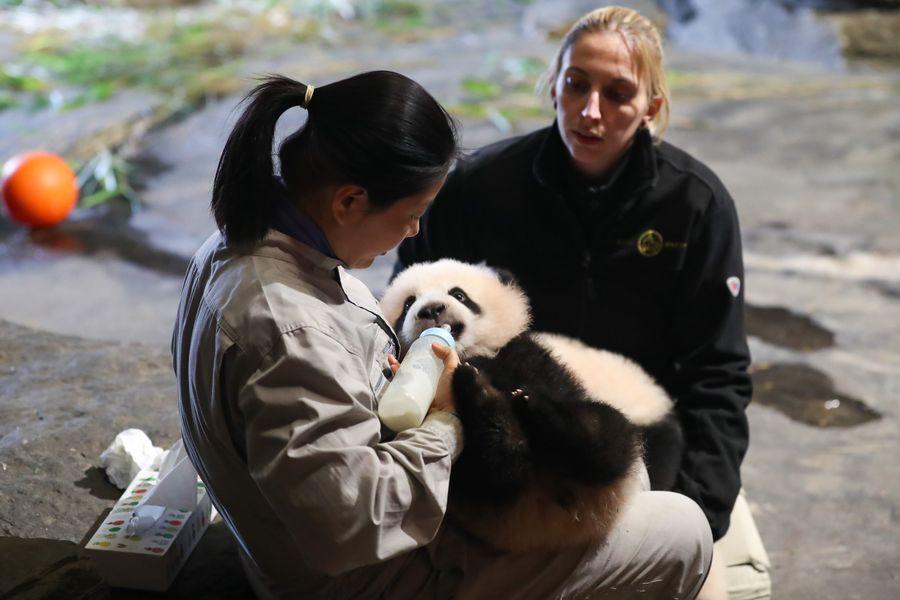 A zookeeper feeds a giant panda cub at the Pairi Daiza zoo in Brugelette, Belgium. (Xinhua/Zhang Cheng)