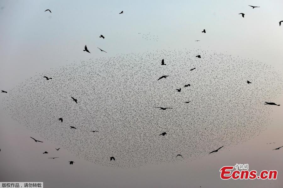 A picture taken on January 2, 2020, shows a murmuration of starlings next to a stork during their traditional dance before landing to sleep on the Jordan Valley in the West Bank along the border with Jordan. (Photo/Agencies)