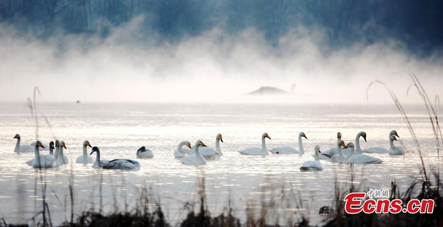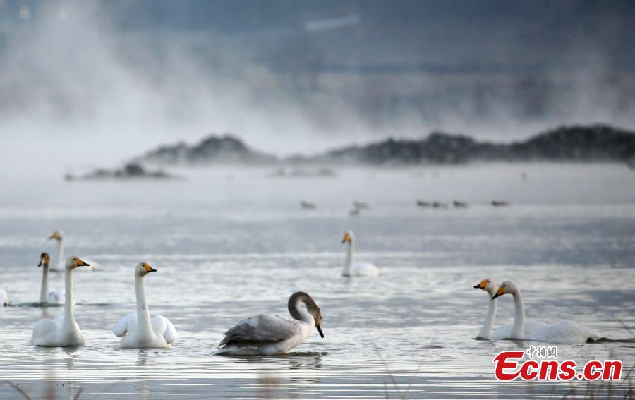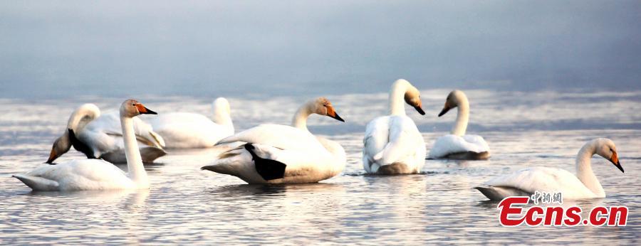 Swans swim in the Yellow River in Hualong Hui autonomous county under Haidong city in Northwest China's Qinghai province, January 3, 2020. (Photo: China News Service/Li Yufeng)