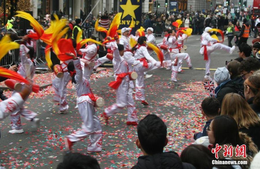 British-Chinese performers take part in London’s New Year’s Day Parade, Jan. 1, 2020. The 34th London’s New Year’s Day Parade kicked off in central London from 12 pm to 3:20 pm on the first day of 2020.Thousands of performers, including dancers, acrobats, cheerleaders, marching bands and historic vehicles across the world, participated in the event. It was the third time that British Chinese community had been invited. London’s New Year’s Day Parade had raised more than 1 million pounds for clarity since the first started in 1987.