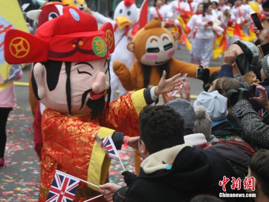 “Caishenye”, which means“The God of Wealth”in Chinese myths and legends, wows spectators at London’s New Year’s Day Parade, Jan. 1, 2020.