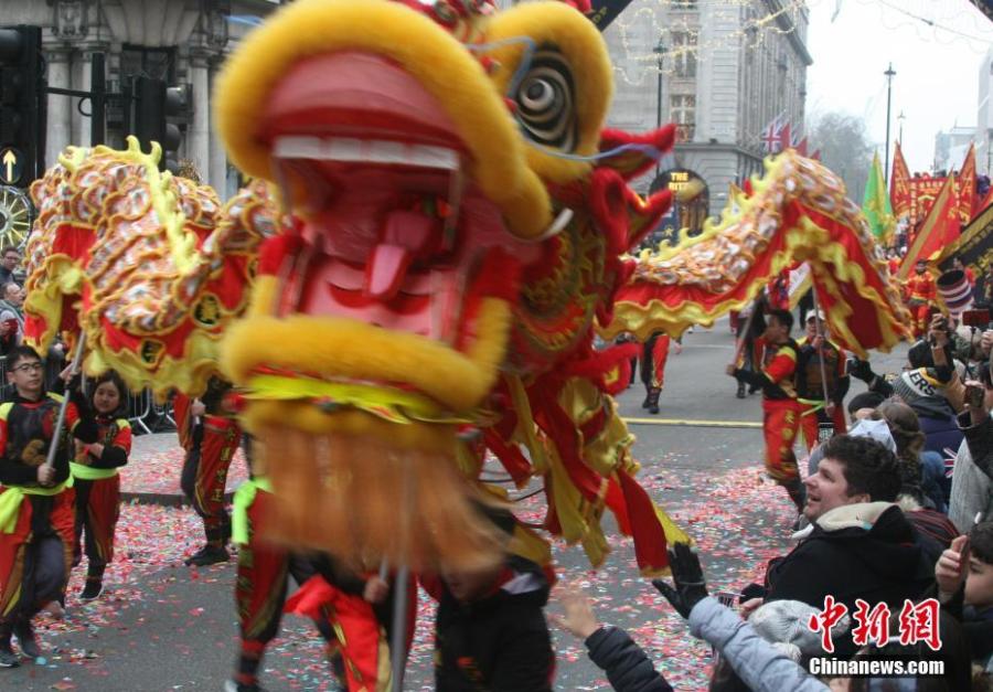 Chinese Dragon and Lion’show is staged at London’s New Year’s Day Parade, Jan. 1, 2020.The dance had become a must-do performance in many festivals in China.
