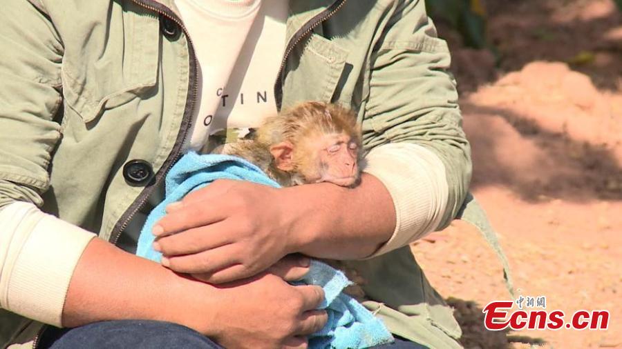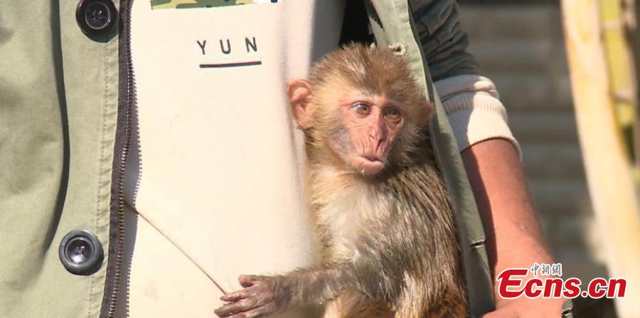 A macaque cub snuggles with a villager after being rescued in Ximeng county of Southwest China’s Yunnan province. The baby monkey who probably got lost from home now is being taken care of by local police. It will be released to the wild after trainings. Macaque is listed as second-class protected animal in China. (Photo: China News Service/ Bi Xiaodong)