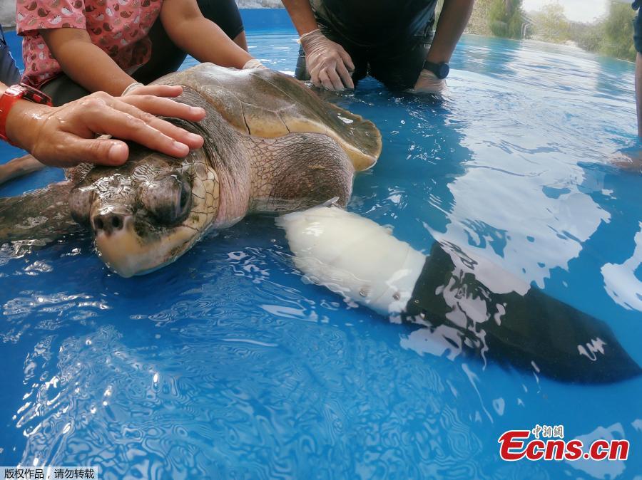 Female turtle named Goody tests out the first prosthetic flipper that will help other sea turtles injured from fishing gears to swim again, in Phuket, Thailand January 10, 2020. Picture taken January 10, 2020. (Photo/Agencies)
