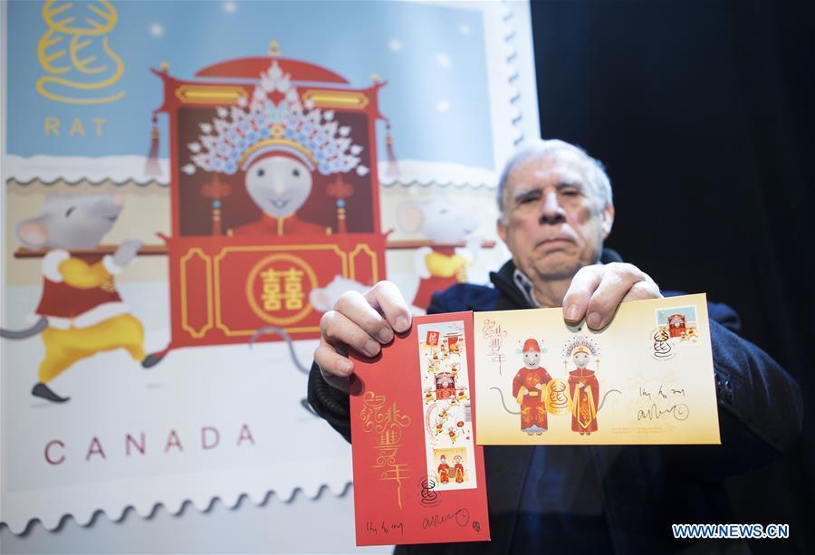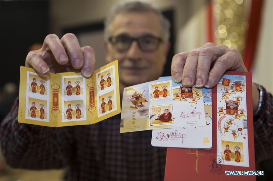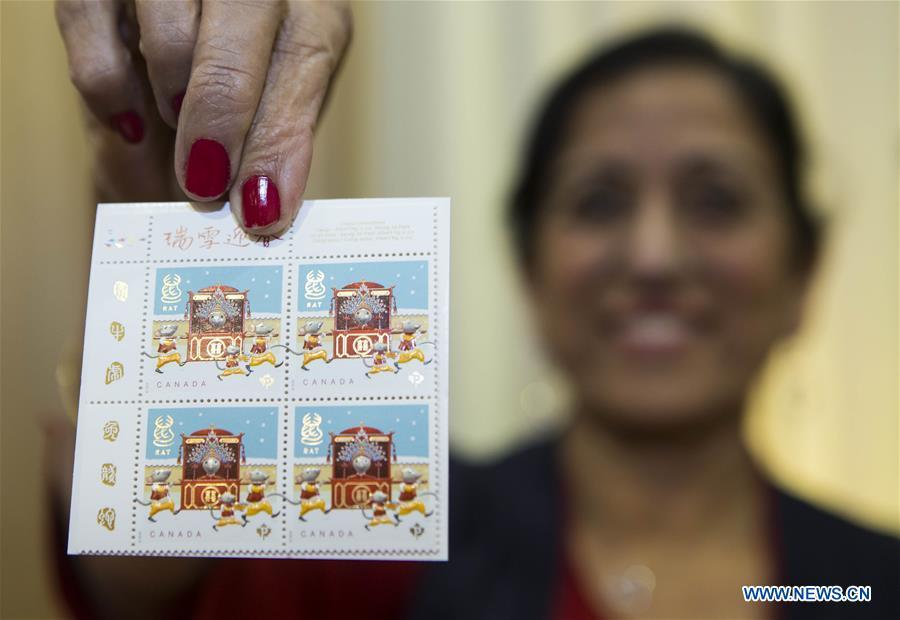 A staff member of Canada Post shows domestic-rate stamps of the year of the Rat at Chinese Cultural Centre of Greater Toronto in Toronto, Canada, Jan. 16, 2020. Canada Post unveiled the Year of the Rat stamps and collectibles in celebration of the upcoming Chinese Lunar Year of the Rat on Thursday. (Photo by Zou Zheng/Xinhua)