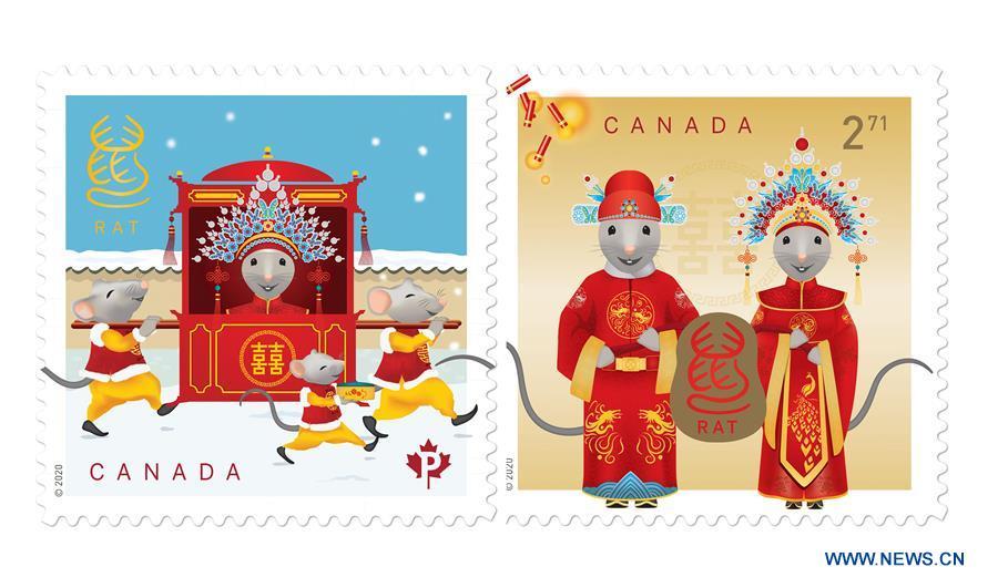 The combined photo provided by Canada Post on Jan. 16, 2020 shows the samples of domestic-rate stamp (L) and international-rate stamp of the year of the Rat. Canada Post unveiled the Year of the Rat stamps and collectibles in celebration of the upcoming Chinese Lunar Year of the Rat on Thursday. (Canada Post/Handout via Xinhua)