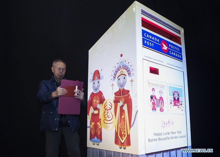 A man takes photos of the year of the Rat stamps-themed mailbox during the unveiling ceremony of the year of the Rat stamps at Chinese Cultural Centre of Greater Toronto in Toronto, Canada, Jan. 16, 2020. Canada Post unveiled the Year of the Rat stamps and collectibles in celebration of the upcoming Chinese Lunar Year of the Rat on Thursday. (Photo by Zou Zheng/Xinhua)
