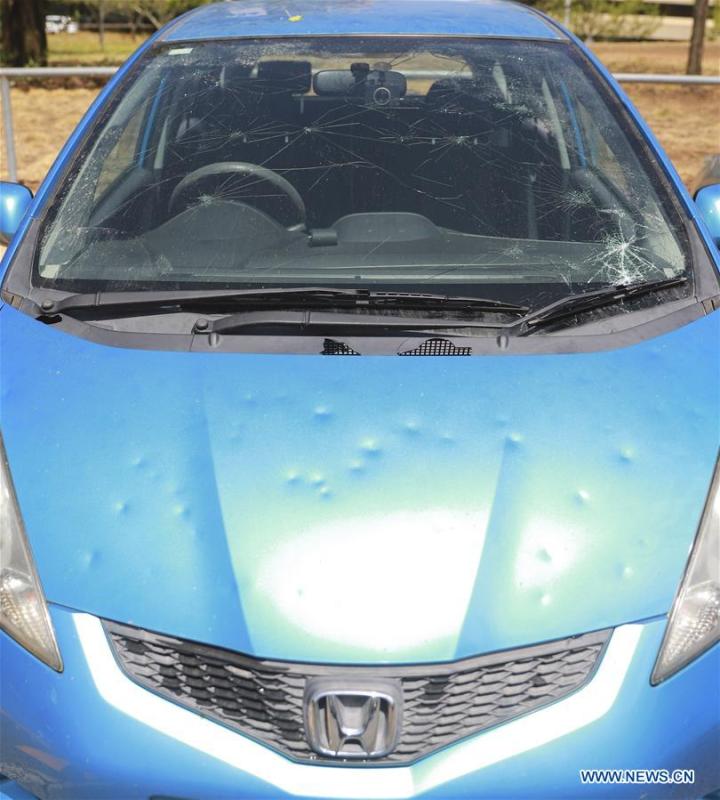 Photo taken on Jan. 20, 2020 shows serious vehicle damages caused by huge hailstones in Canberra, Australia. Huge hailstones and heavy winds have torn through Canberra in a storm on Monday, causing serious traffic jams and vehicle damage. (Photo by Liu Changchang/Xinhua)