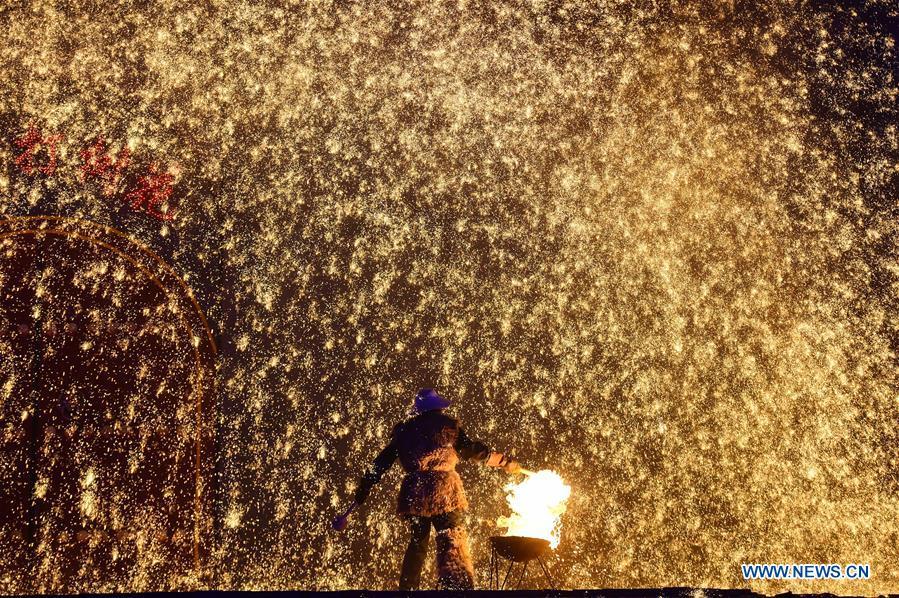 A performer throws molten iron to create fireworks during a lantern fair in Datong, north China's Shanxi Province, Jan. 23, 2020. (Xinhua/Chai Ting)