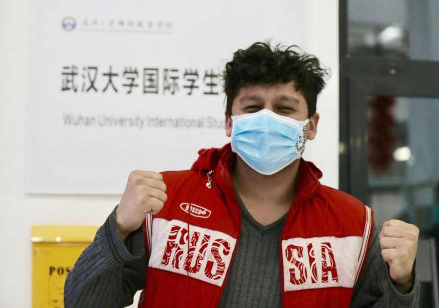 Davlatov Khairiddin, a foreign student studying at Wuhan University, shouts "Wuhan, Jiayou" in Wuhan, Central China's Hubei province, on Feb 1, 2020. Central China's Hubei province is home to multiple universities, with a total of 1.2 million university students. Many students left their universities before the novel coronavirus became widespread. However, many foreign students chose to stay in the city to fight the epidemic. (China Daily/Zhu Xingxin)