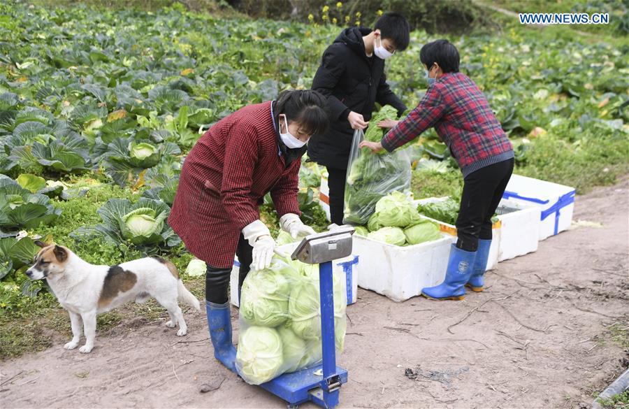 Workers harvest vegetables in a field in Matuo Village of Yunyang County in southwest China's Chongqing, Feb. 5, 2020. Since the outbreak of the novel coronavirus pneumonia, Yunyang County has actively guided vegetable production bases and farmers to harvest vegetables and increase market supply through online and offline channels. The county also strengthened the daily supervision of the market to keep vegetable prices stable. (Xinhua/Wang Quanchao)