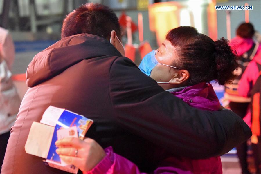 Chen Hui (R), a member of the medical team, hugs her family member before leaving for Wuhan, the epicenter of the coronavirus outbreak, in Urumqi, northwest China's Xinjiang Uygur Autonomous Region, Feb. 4, 2020. The second batch of a medical team comprised of 102 members from Xinjiang left for Wuhan on Tuesday to aid the novel coronavirus control efforts there. So far, Xinjiang has sent a total of 244 medics to Wuhan. (Xinhua/Ding Lei)