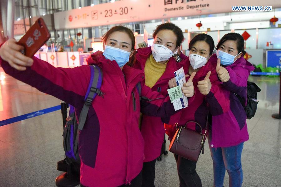 Medical team members take a selfie before leaving for Wuhan, the epicenter of the coronavirus outbreak, at Diwopu International Airport in Urumqi, northwest China's Xinjiang Uygur Autonomous Region, Feb. 4, 2020. The second batch of a medical team comprised of 102 members from Xinjiang left for Wuhan on Tuesday to aid the novel coronavirus control efforts there. So far, Xinjiang has sent a total of 244 medics to Wuhan. (Xinhua/Ding Lei)