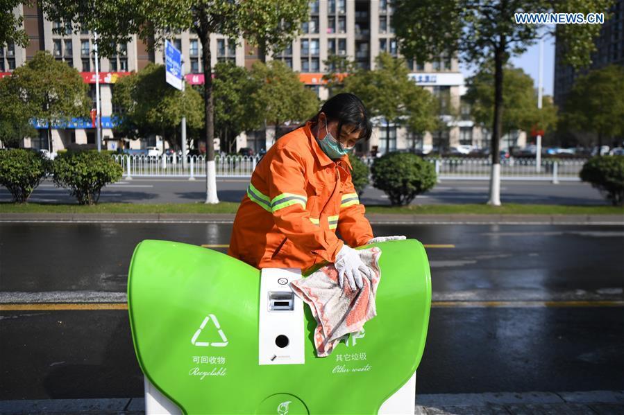 A sanitation worker disinfects a garbage bin on the street in Changsha, central China's Hunan Province, Feb. 5, 2020. Over 9,000 sanitation workers and 700 vehicles have been dispatched daily since Jan. 22, 2020 to clean and disinfect the streets, business areas and agricultural products market in Changsha to fight against the coronavirus. (Xinhua/Xue Yuge)