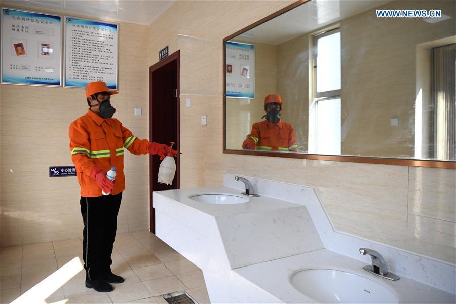 Sanitation workers spray disinfectant at a toilet in Changsha, central China's Hunan Province, Feb. 5, 2020. Over 9,000 sanitation workers and 700 vehicles have been dispatched daily since Jan. 22, 2020 to clean and disinfect the streets, business areas and agricultural products market in Changsha to fight against the coronavirus. (Xinhua/Xue Yuge)