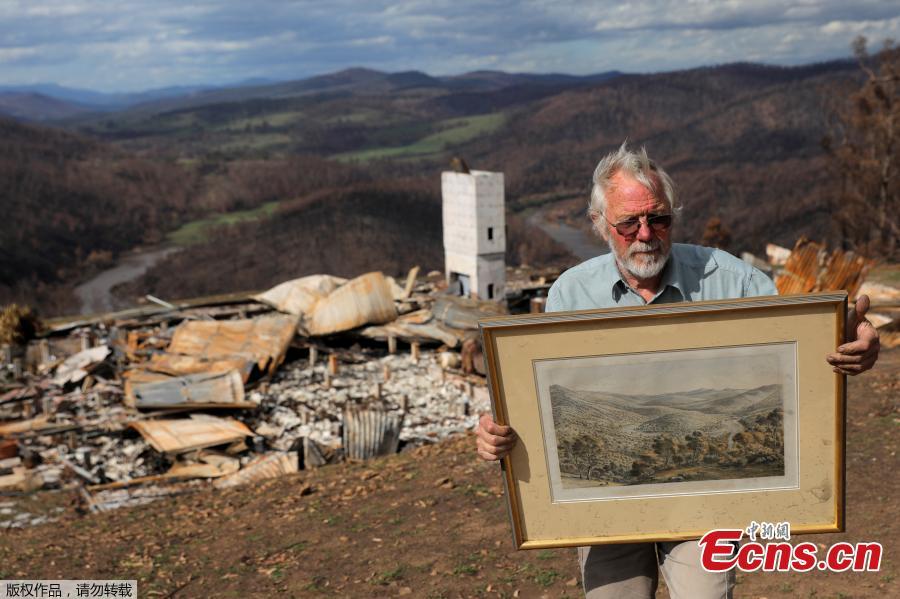 Donald Graham, 68, poses with a lithograph by Eugene von Guerard of the Buchan and Snowy Rivers, which Graham saved from a bushfire as he took shelter in his bunker with his wife Bron, as their home was destroyed by bushfires in Buchan, Victoria, Australia, January 23, 2020. (Photo/Agencies)
