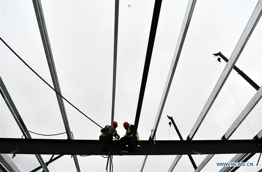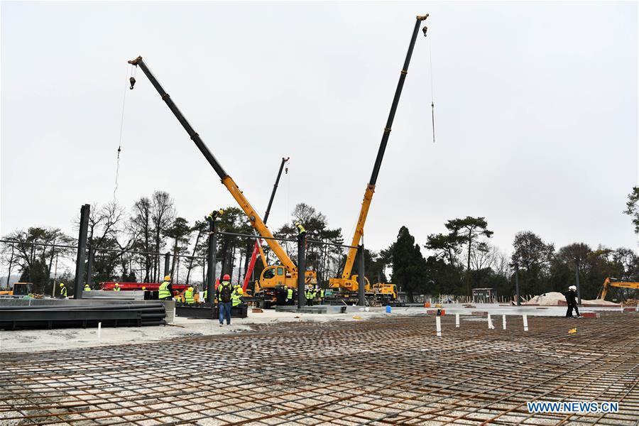 People work at the construction side of the Jiangjunshan section of Guiyang public health center for treatment which is under renovation in Guiyang, southwest China's Guizhou Province, Feb. 6, 2020. The renovation project of the hospital for treating pneumonia patients infected with the novel coronavirus in Guiyang is expected to be completed on Feb. 20 after three phases' construction plan. The hospital will provide 491 beds to patients. (Xinhua/Yang Wenbin)