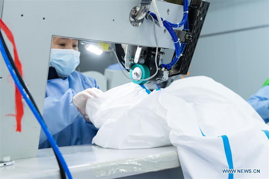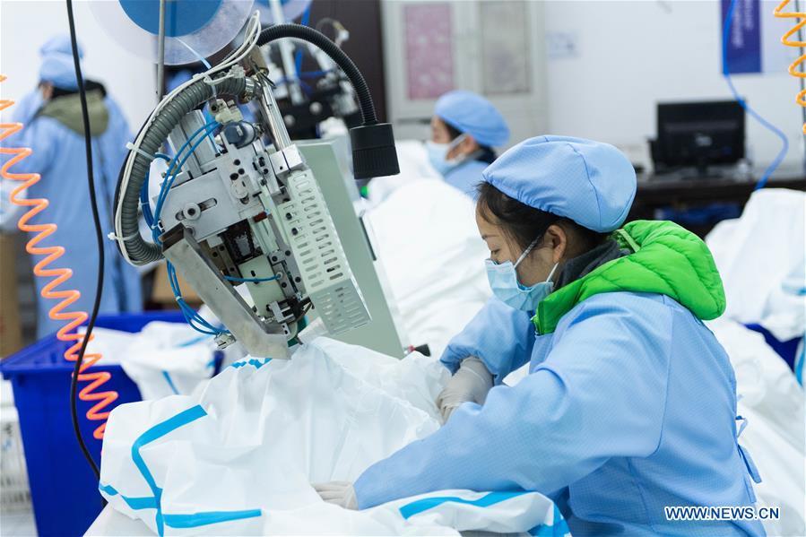 Workers make the protective suits at a special protective equipment company in Xiangtan, central China's Hunan Province, Feb. 5, 2020. Approved by local medical products administration, the company in Xiangtan has started to produce medical protective suits following the novel coronavirus outbreak, with a daily output of 3,000 sets. (Xinhua/Chen Sihan)
