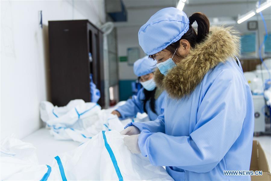 Workers check the protective suits at a special protective equipment company in Xiangtan, central China's Hunan Province, Feb. 5, 2020. Approved by local medical products administration, the company in Xiangtan has started to produce medical protective suits following the novel coronavirus outbreak, with a daily output of 3,000 sets. (Xinhua/Chen Sihan)