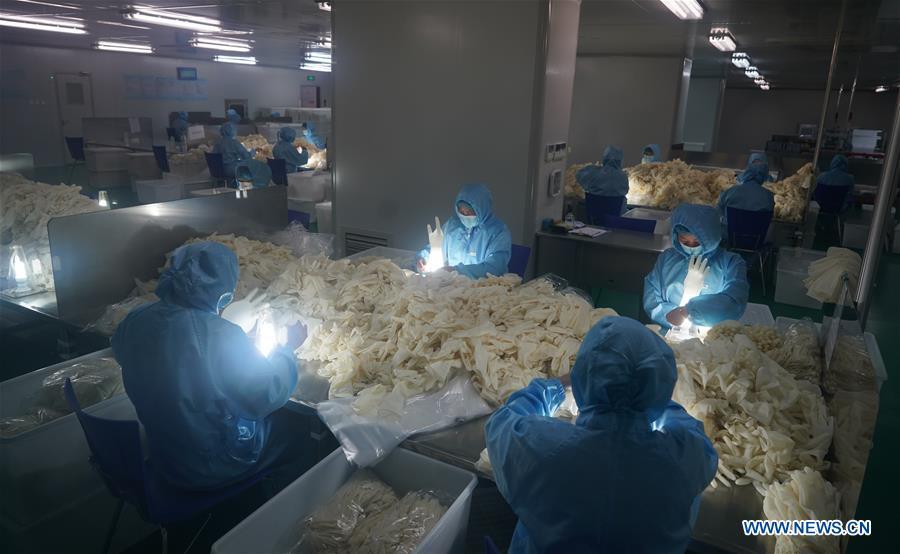 Workers check sterile medical gloves at a workshop of a latex products company in Nanjing, east China's Jiangsu Province, Feb. 6, 2020. The latex products company in Nanjing has rushed to work round-the-clock to increase the supplies and help the fight against the novel coronavirus epidemic. (Xinhua/Ji Chunpeng)