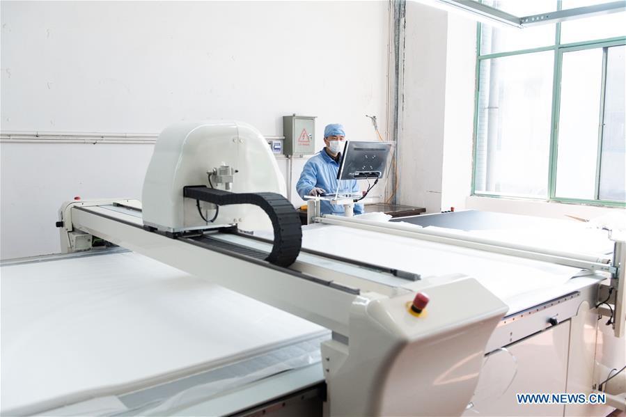 A worker cuts the material for making protective suit through automatic cutting machine at a special protective equipment company in Xiangtan, central China's Hunan Province, Feb. 5, 2020. Approved by local medical products administration, the company in Xiangtan has started to produce medical protective suits following the novel coronavirus outbreak, with a daily output of 3,000 sets. (Xinhua/Chen Sihan)