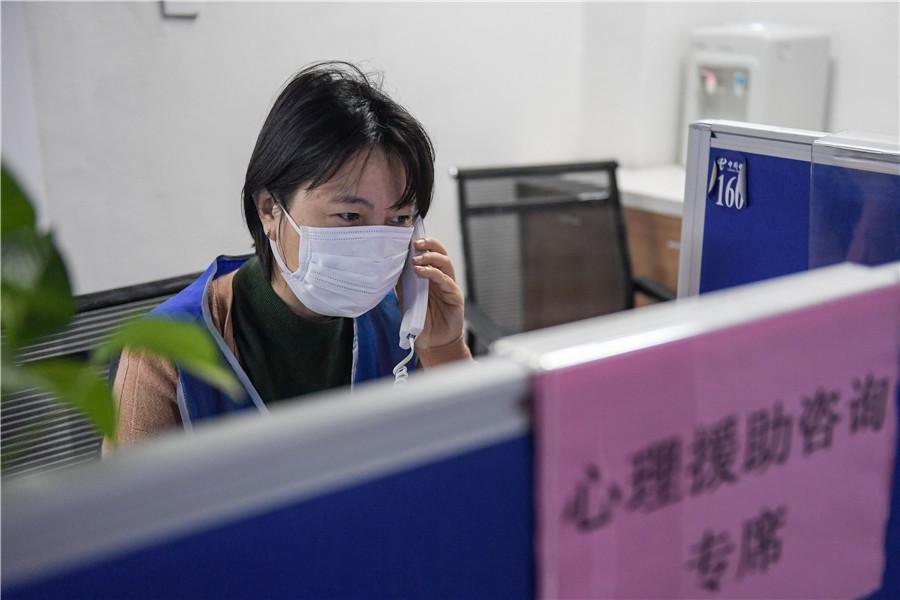 A psychological counselor in Haikou, Hainan province, answers a phone call about the novel coronavirus outbreak on Saturday. [Photo/Xinhua]