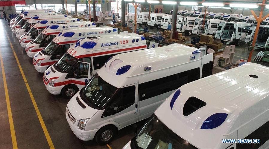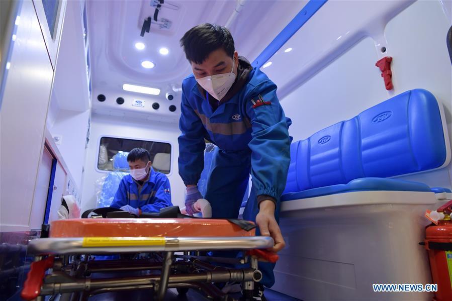 Photo taken on Feb. 6, 2020 shows the ambulances at a manufacturing base of the Jiangling Motors Group Co., Ltd. in Nanchang, east China's Jiangxi Province. The company has rushed to produce negative pressure ambulances for the fight against the novel coronavirus epidemic. (Xinhua/Peng Zhaozhi)