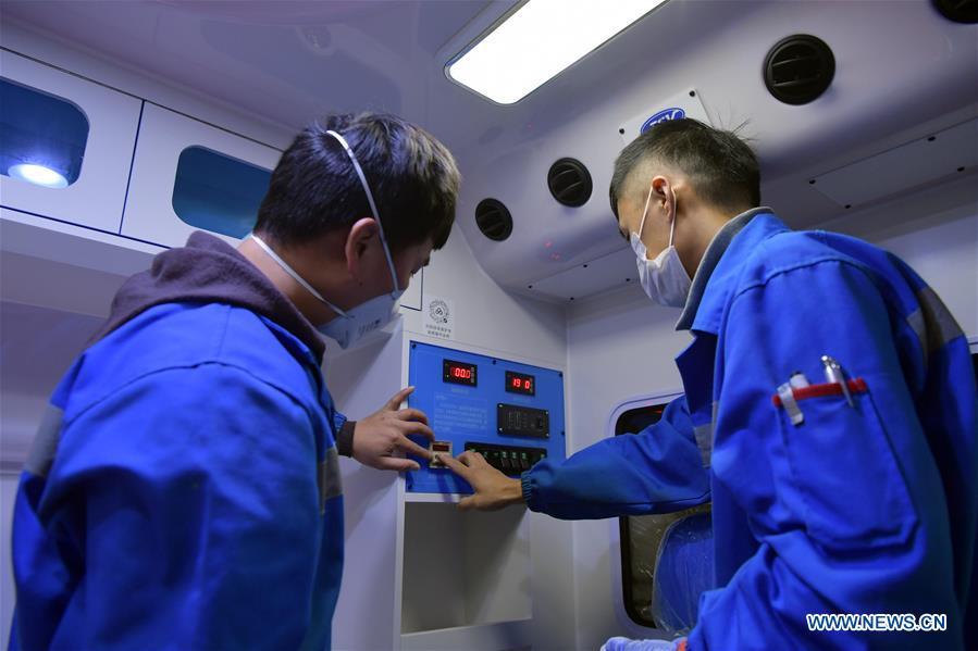 Workers refit an ambulance at a manufacturing base of the Jiangling Motors Group Co., Ltd. in Nanchang, east China's Jiangxi Province, Feb. 6, 2020. The company has rushed to produce negative pressure ambulances for the fight against the novel coronavirus epidemic. (Xinhua/Peng Zhaozhi)