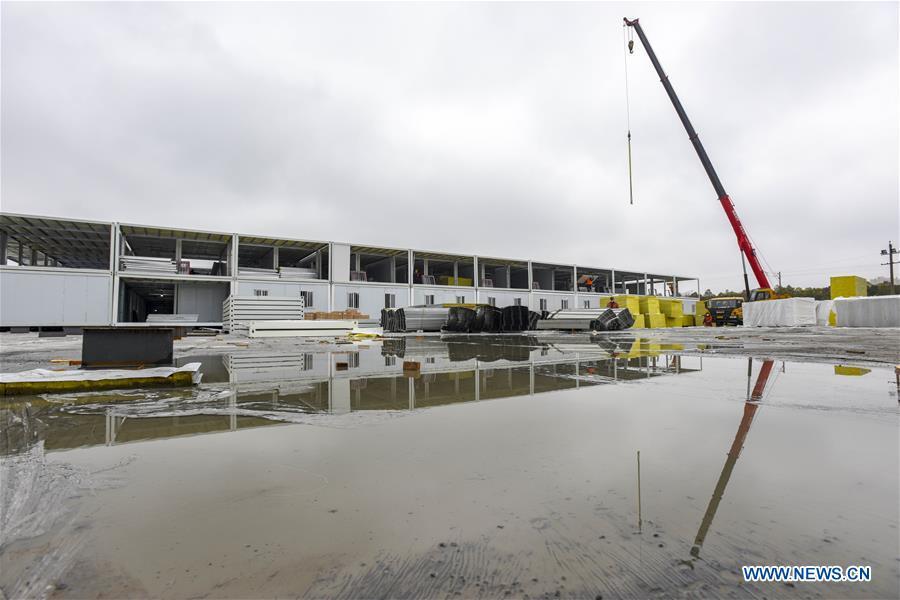 Photo taken on Feb. 11, 2020 shows the construction site of a makeshift hospital in Anlu City, which is under the administration of Xiaogan City, in central China's Hubei Province. To fight the novel coronavirus pneumonia (NCP) epidemic, a makeshift hospital replicating Beijing's SARS treatment model in 2003 is under construction in Anlu City, central China's Hubei Province, with a capacity of 418 beds. The construction of the first ward is expected to be completed on Feb. 15. The city of Xiaogan has reported 2,642 confirmed cases of NCP by the end of Monday, including 412 cases reported in Anlu. (Xinhua/Hu Huhu)