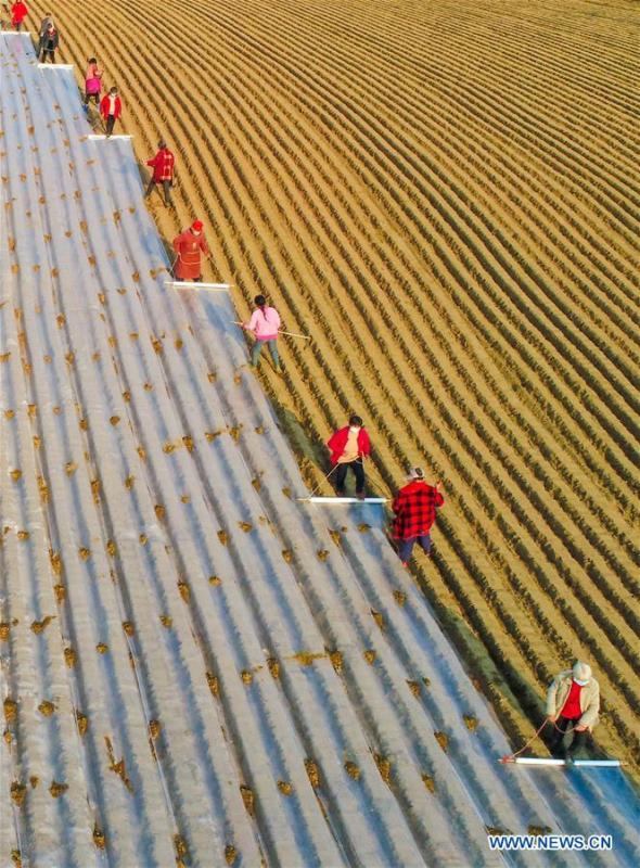 Aerial photo taken on Feb. 11, 2020 shows villagers working in fields in Sangshulin Village, Tuopai Township of Shehong City, southwest China's Sichuan Province. Farmers across China have resumed production after taking necessary protection measures against novel coronavirus. By Feb. 10, about 94.6 percent of the country's major grain production and processing firms had resumed production. (Photo by Liu Changsong/Xinhua)