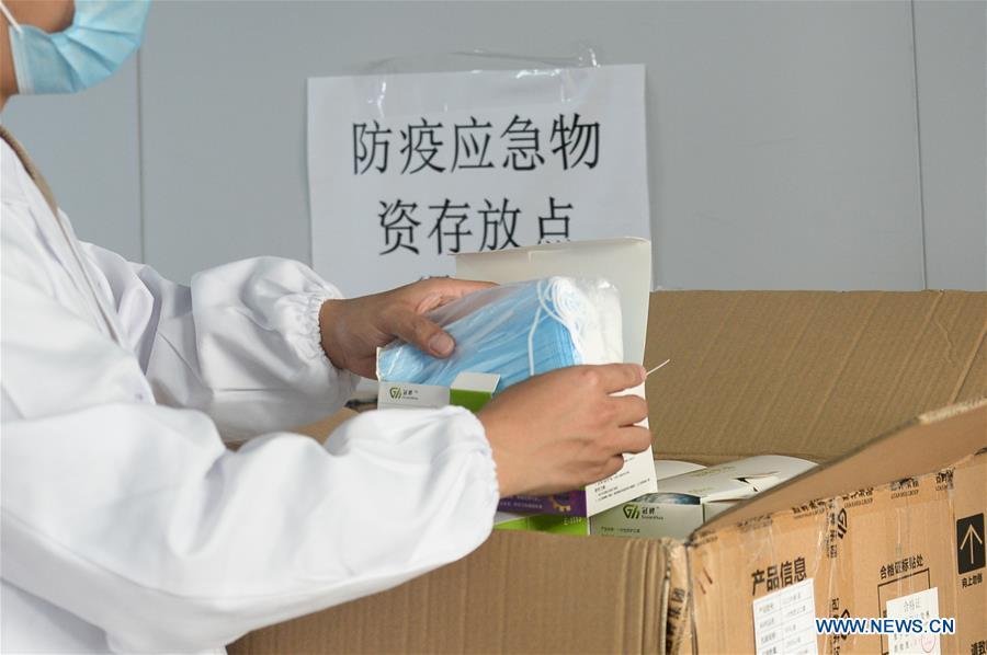 An epidemic prevention staff member shows the face masks prepared for workers at the construction site of China Eastern Airlines' production auxiliary area (phase one) in Chengdu Tianfu International Airport in Chengdu, southwest China's Sichuan Province, Feb. 11, 2020. The construction of China Eastern Airlines' production auxiliary area (phase one) in Chengdu Tianfu International Airport has resumed as a demonstration construction site in Chengdu. Chengdu Municipal Housing and Urban-Rural Development Bureau launched a series of measures to prevent and control the outbreak of coronavirus, demanding that all the construction projects in the city meet epidemic prevention standards before applying for resumption. (Xinhua/Liu Kun)