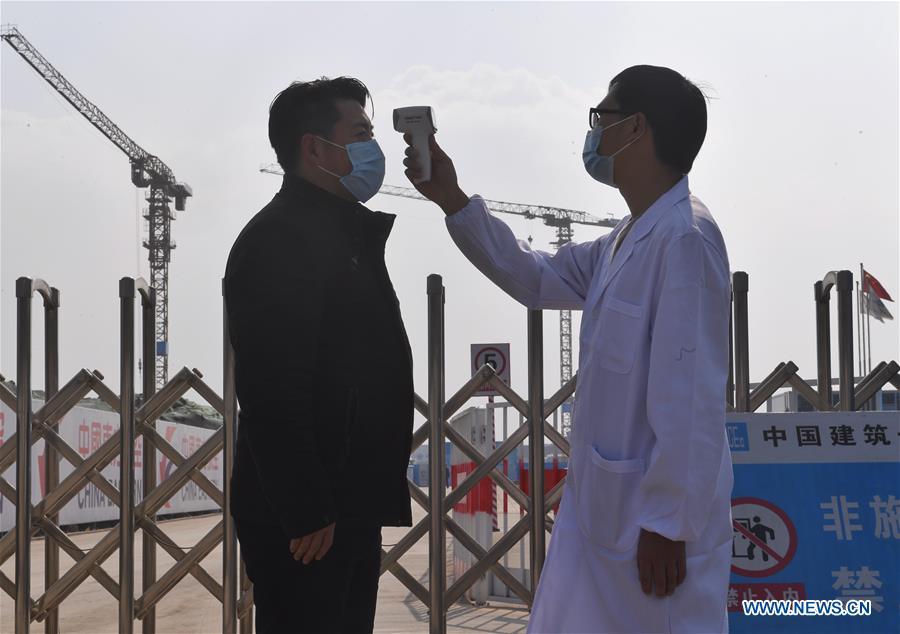 An epidemic prevention staff member checks a person's body temperature before the latter enters the construction site of China Eastern Airlines' production auxiliary area (phase one) in Chengdu Tianfu International Airport in Chengdu, southwest China's Sichuan Province, Feb. 11, 2020. The construction of China Eastern Airlines' production auxiliary area (phase one) in Chengdu Tianfu International Airport has resumed as a demonstration construction site in Chengdu. Chengdu Municipal Housing and Urban-Rural Development Bureau launched a series of measures to prevent and control the outbreak of coronavirus, demanding that all the construction projects in the city meet epidemic prevention standards before applying for resumption. (Xinhua/Liu Kun)