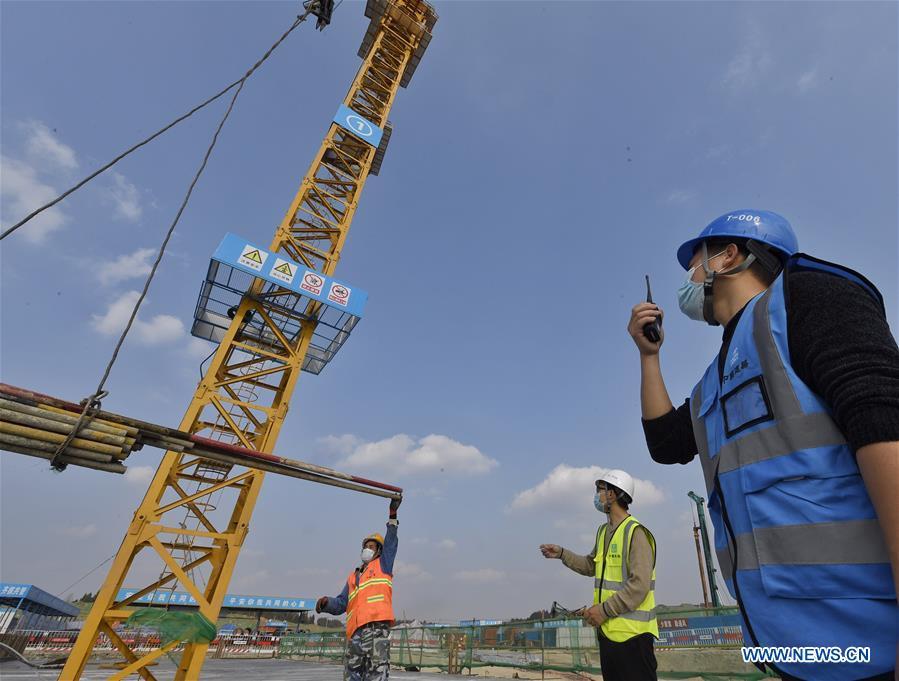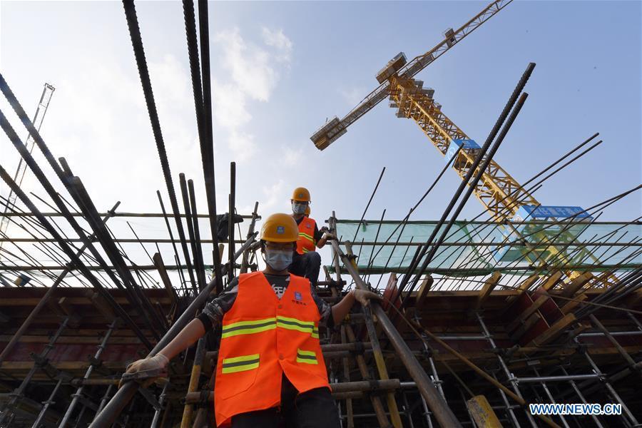 Workers work at the construction site of China Eastern Airlines' production auxiliary area (phase one) in Chengdu Tianfu International Airport in Chengdu, southwest China's Sichuan Province, Feb. 11, 2020. The construction of China Eastern Airlines' production auxiliary area (phase one) in Chengdu Tianfu International Airport has resumed as a demonstration construction site in Chengdu. Chengdu Municipal Housing and Urban-Rural Development Bureau launched a series of measures to prevent and control the outbreak of coronavirus, demanding that all the construction projects in the city meet epidemic prevention standards before applying for resumption. (Xinhua/Liu Kun)