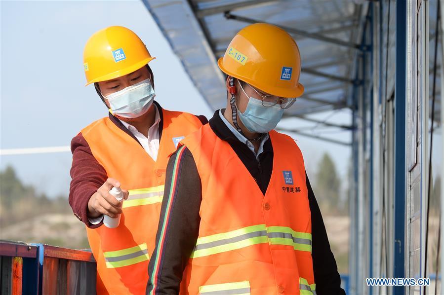 A worker helps disinfect a coworker before entering the dormitory at the construction site of China Eastern Airlines' production auxiliary area (phase one) in Chengdu Tianfu International Airport in Chengdu, southwest China's Sichuan Province, Feb. 11, 2020. The construction of China Eastern Airlines' production auxiliary area (phase one) in Chengdu Tianfu International Airport has resumed as a demonstration construction site in Chengdu. Chengdu Municipal Housing and Urban-Rural Development Bureau launched a series of measures to prevent and control the outbreak of coronavirus, demanding that all the construction projects in the city meet epidemic prevention standards before applying for resumption. (Photo by Xu Bingjie/Xinhua)